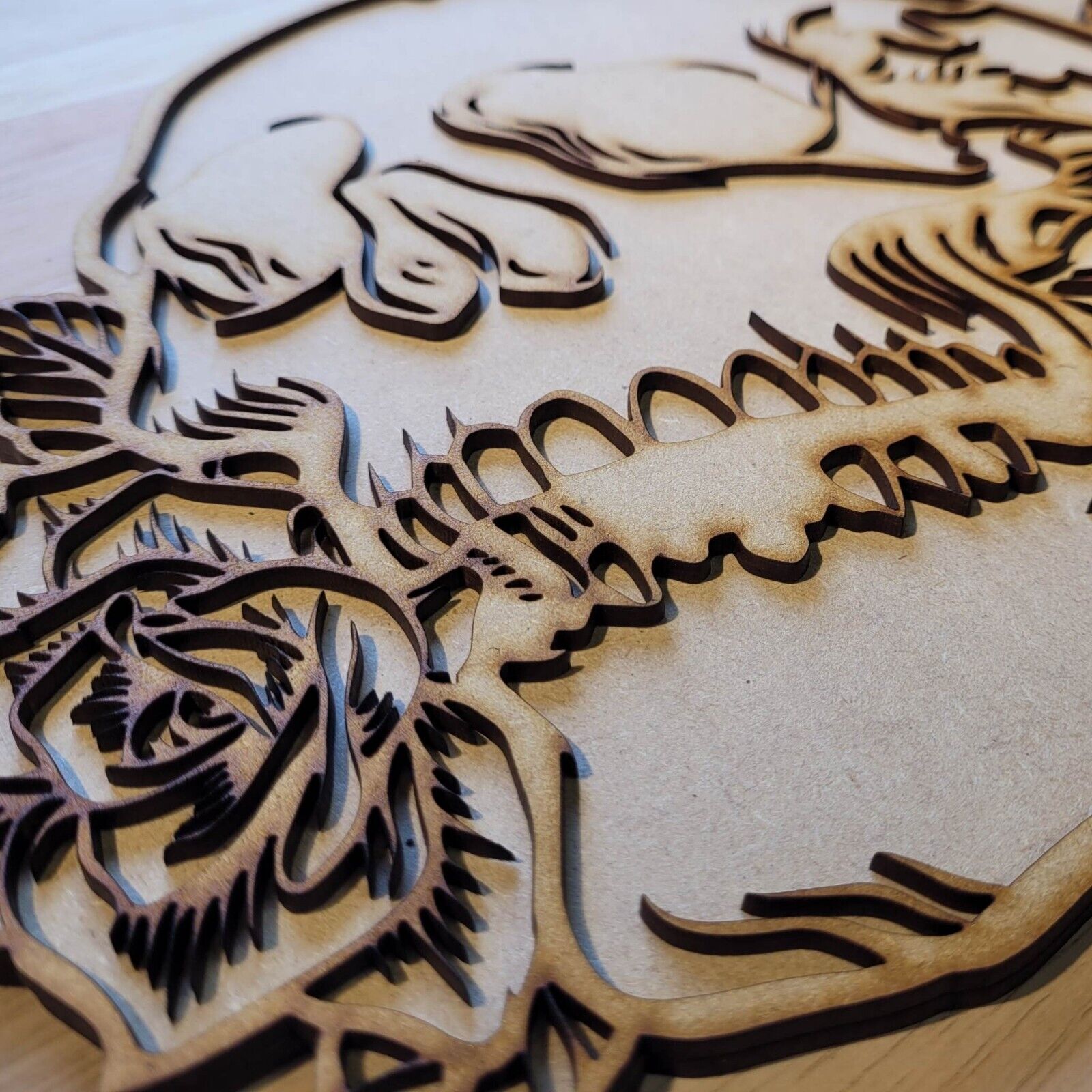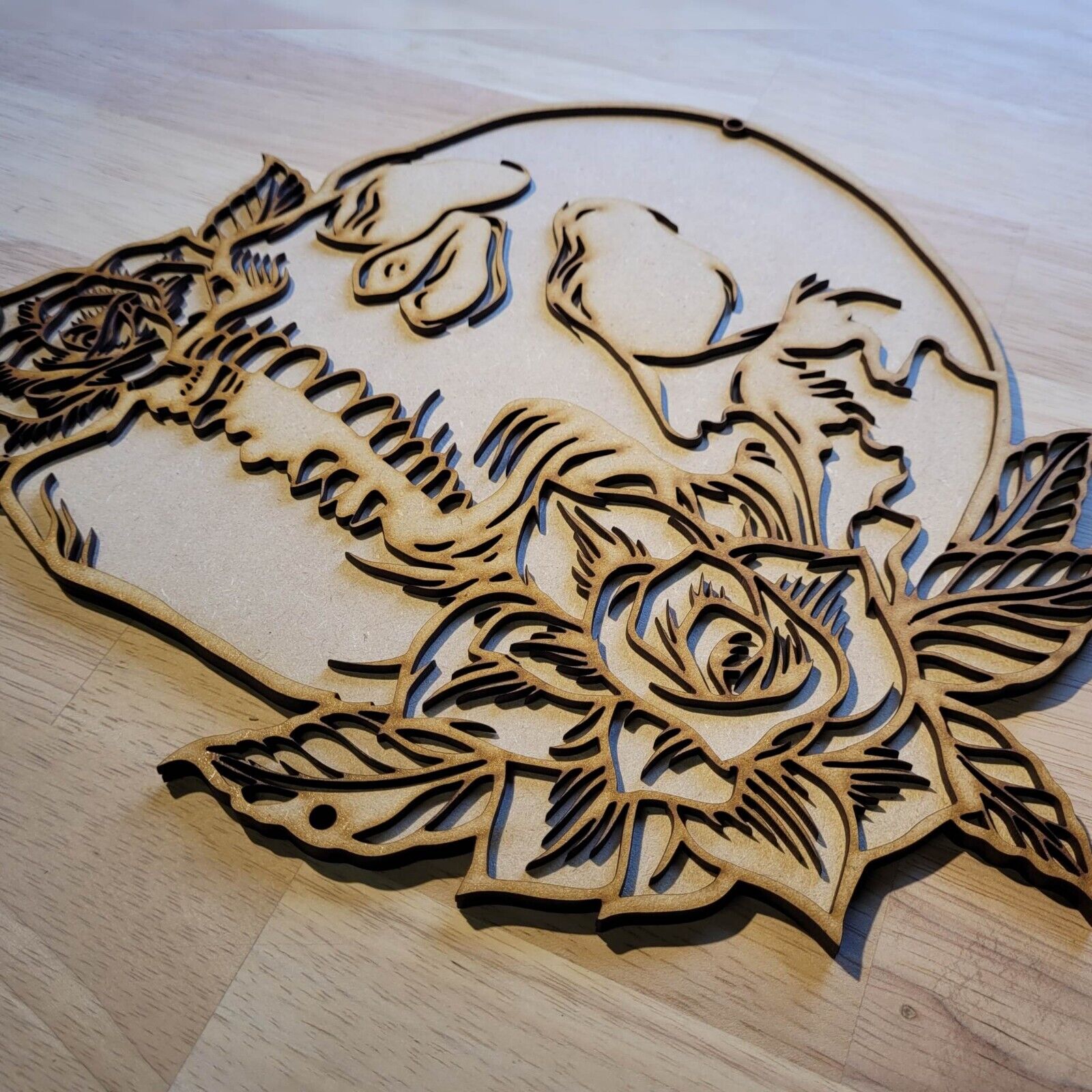 * 6 mm Thick 3D Wooden Floral Skull Tattoo style Decorative Sign *