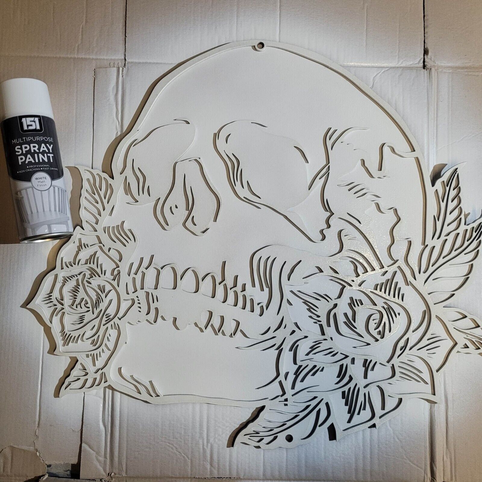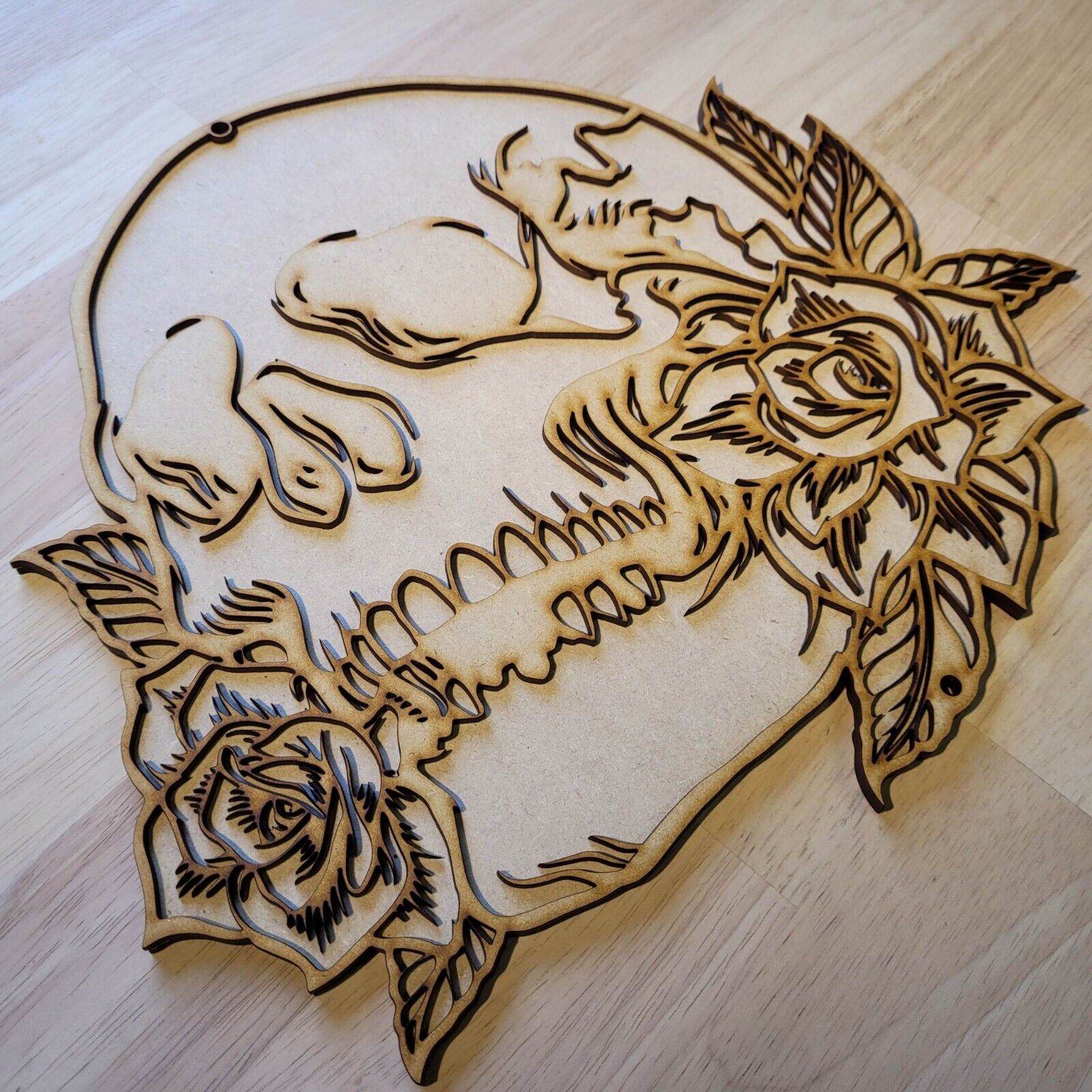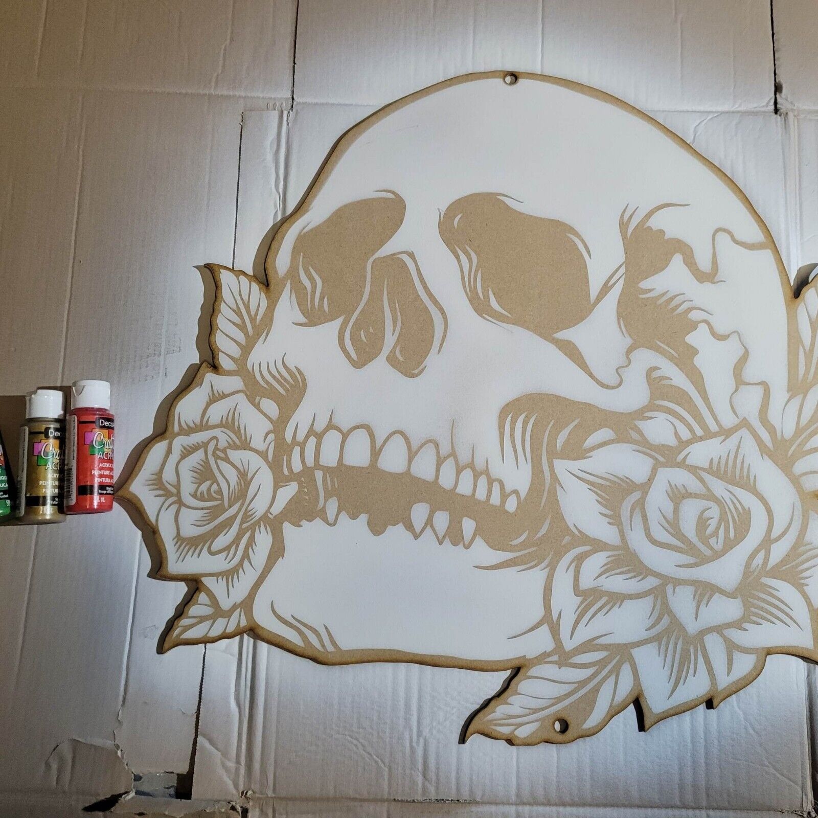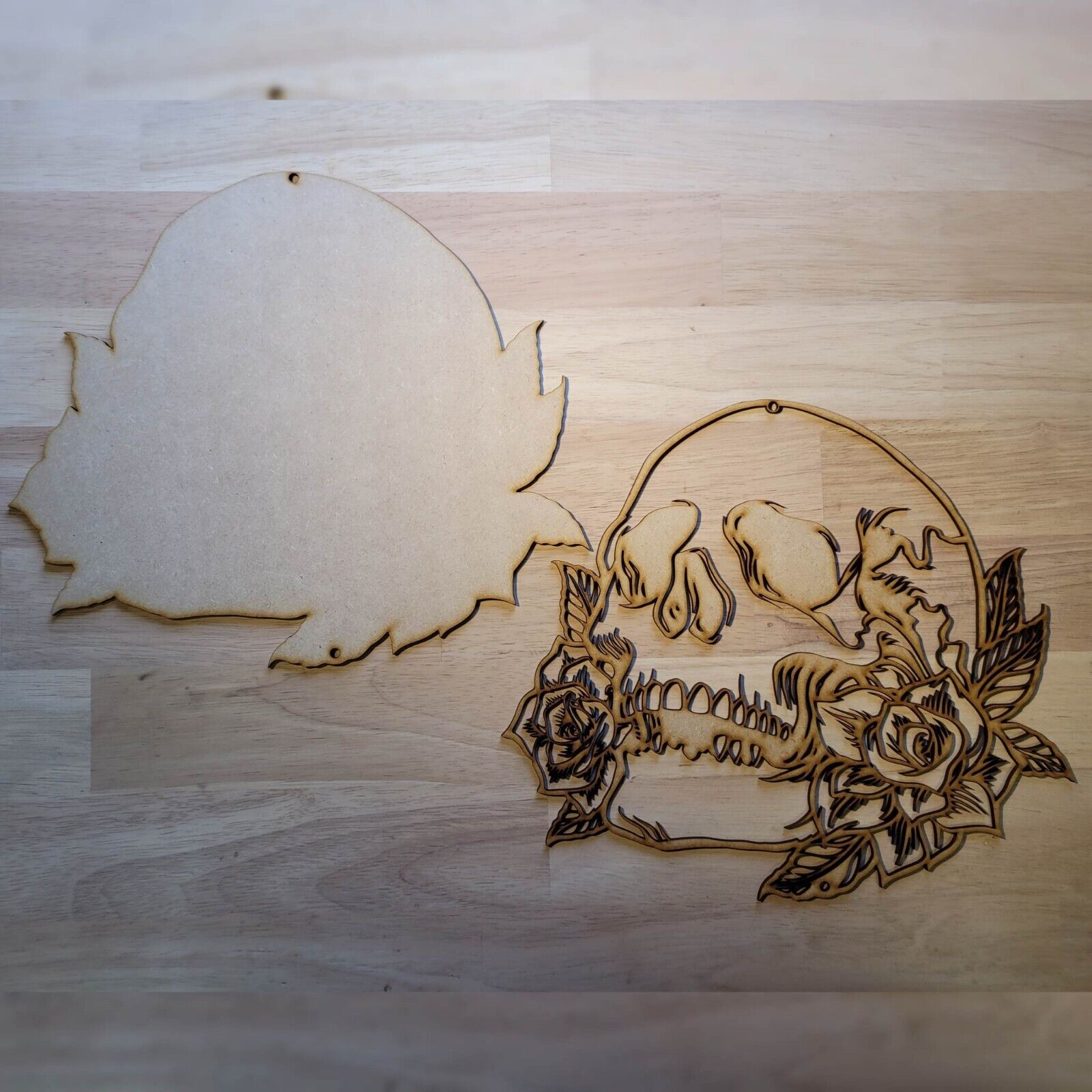 Large Wooden 3D Floral Skull Tattoo Style Sign Wall Art Hanging Plaque Unpainted