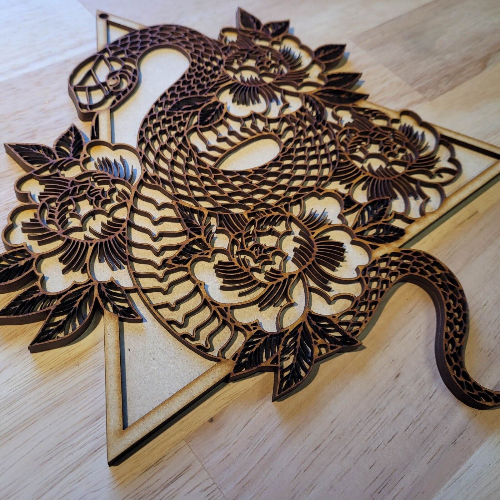 * 6 mm Thick 3D Wooden Tattoo style Flower Rose Snake Sign *